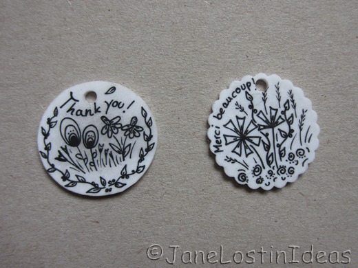 I like to make this little drawings. On my desk there are now always some foil pieces and when I have a minute to relax I draw some flowers (mainly flowers). I also made some with names on, for kids to mark their pencil cases! I think there are lots of possibilities to use those tags and I am happy I found out about shrinking foil!